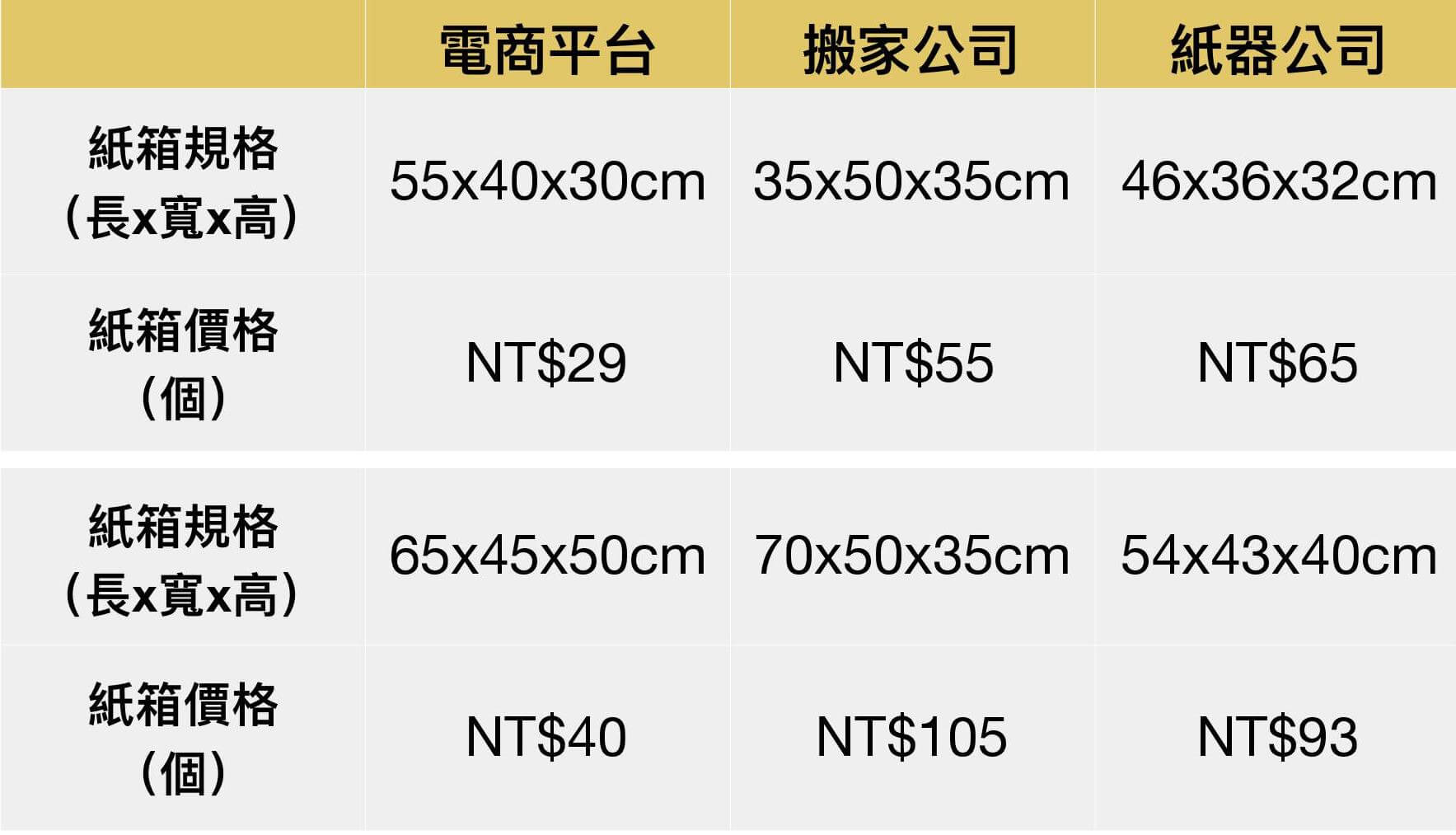 市面上要購買搬家紙箱的管道有很多種,例如:電商平台、搬家公司、紙器公司。以下幫大家整理一個表格歸納出3個管道所購買到的紙箱價格、尺寸。